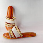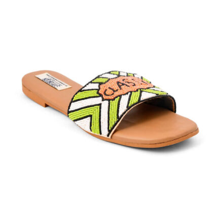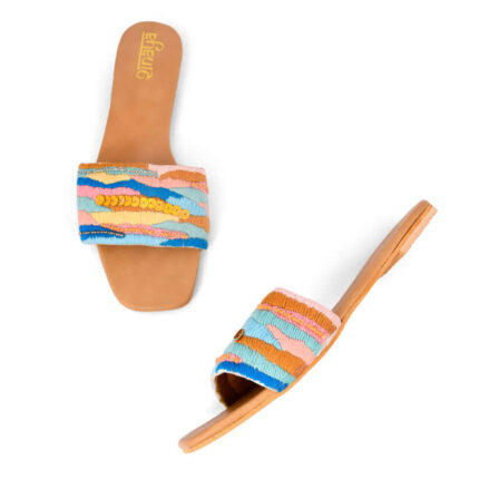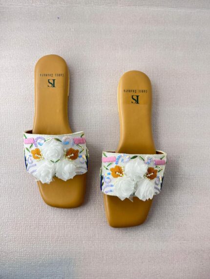 Hand embroidered stone,cutdana work sliders with 3d floral pattern . Be style ready with our multi embroidered slip ons. This is the perfect combination of style with comfort for women as it is crafted with comfy cushioned sole. Hand embroidered beads, thread and sequins work sliders beautifully curated in slight heels with tissue flowers in middle for your every wedding style.