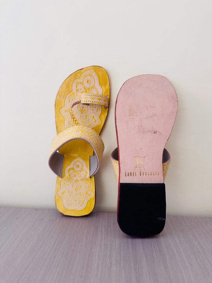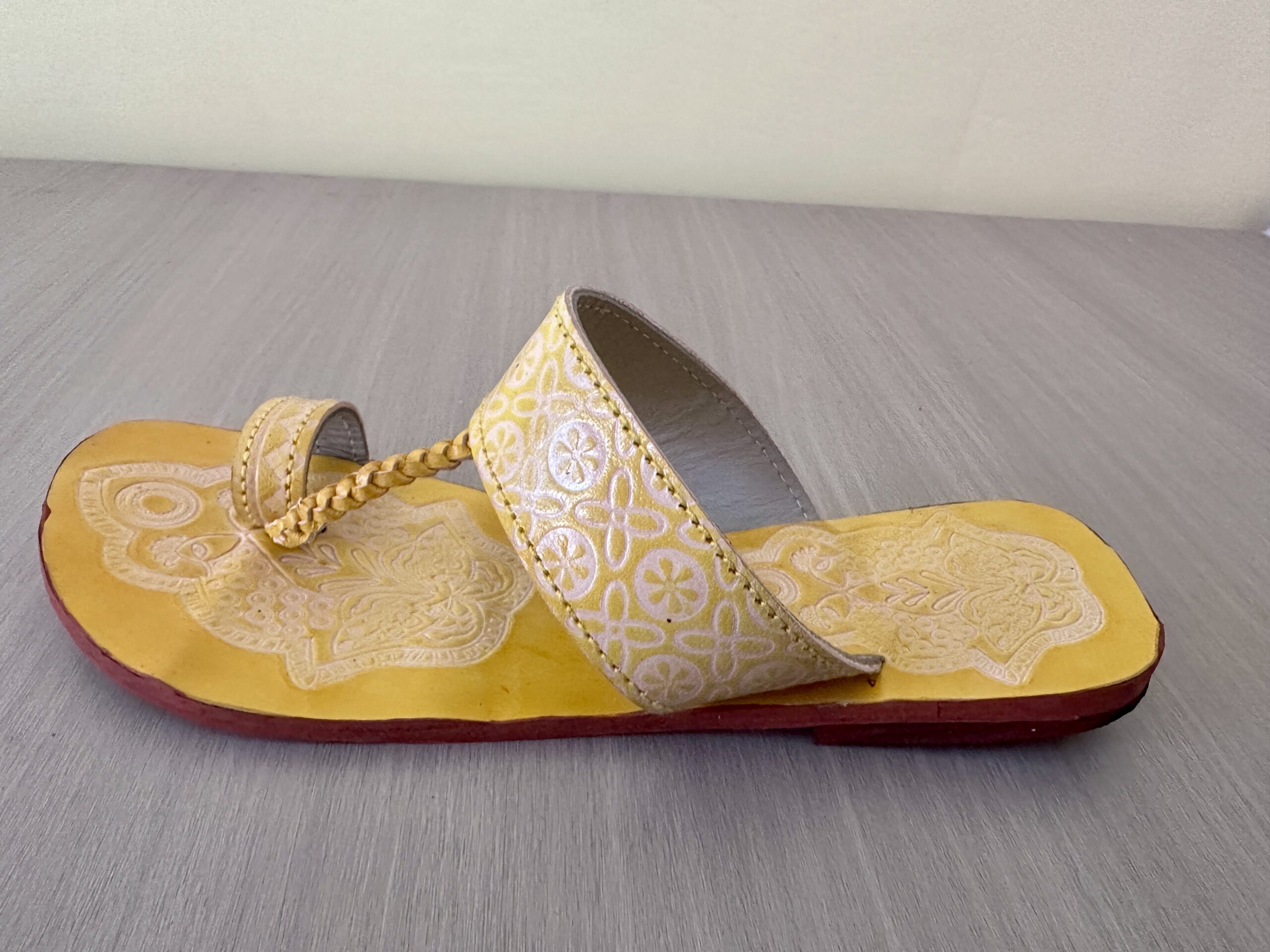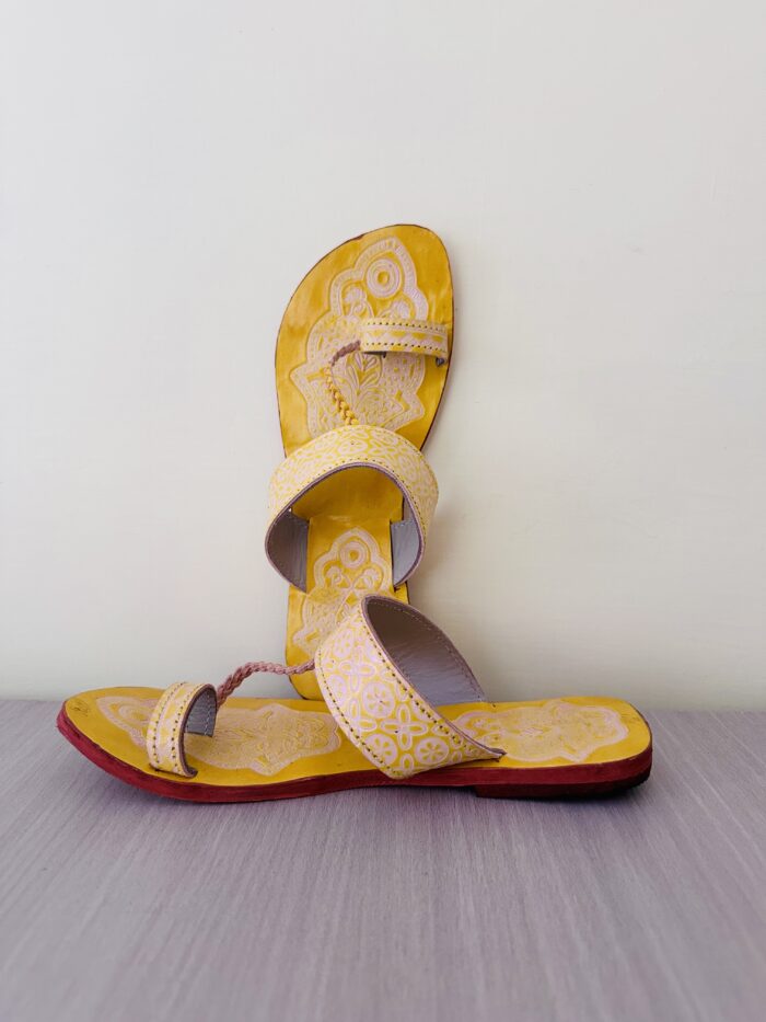“Indulge in the artistry of our hand-painted Kolhapuri chappals, crafted with love on genuine leather. Originating from the cultural heartland of Kolhapur, with ‘PEELA DORI ART‘ pair is a testament to the cherished tradition.