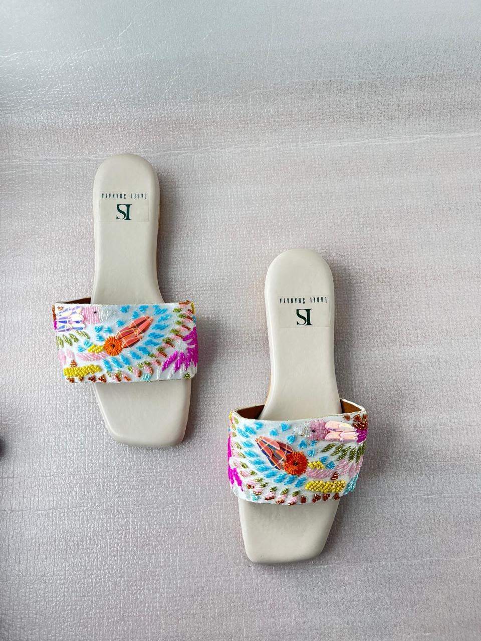 Be style ready with our multi embroidered slip ons. This is the perfect combination of style with comfort for women as it is crafted with comfy cushioned sole. Hand embroidered beads, thread and sequins work sliders beautifully curated in slight heels multi colour which pairs with your every wedding style.