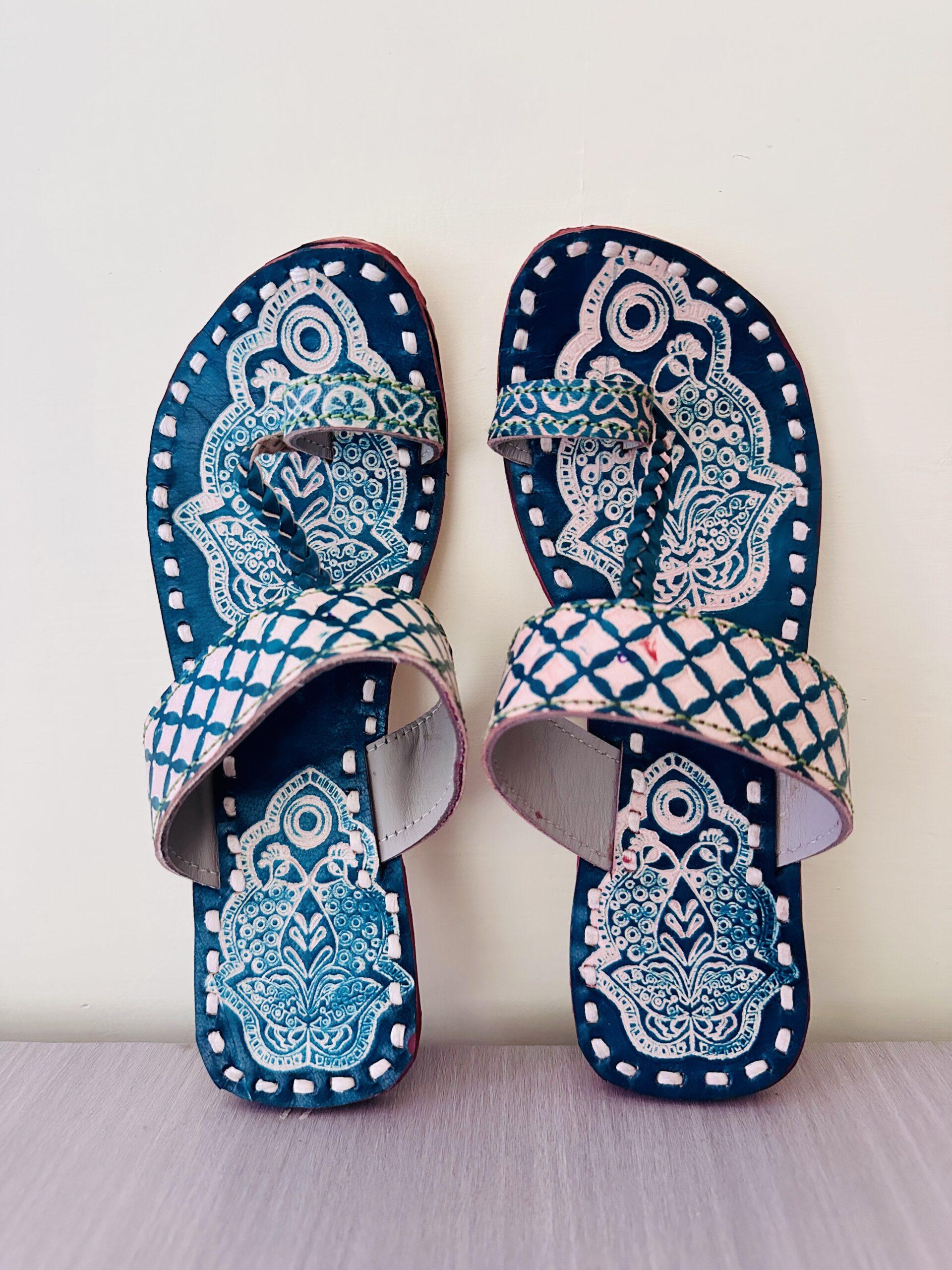 “Indulge in the artistry of our hand-painted Kolhapuri chappals, crafted with love on genuine leather. Originating from the cultural heartland of Kolhapur, with ‘PEACOCK DORI ART‘ pair is a testament to the cherished tradition.