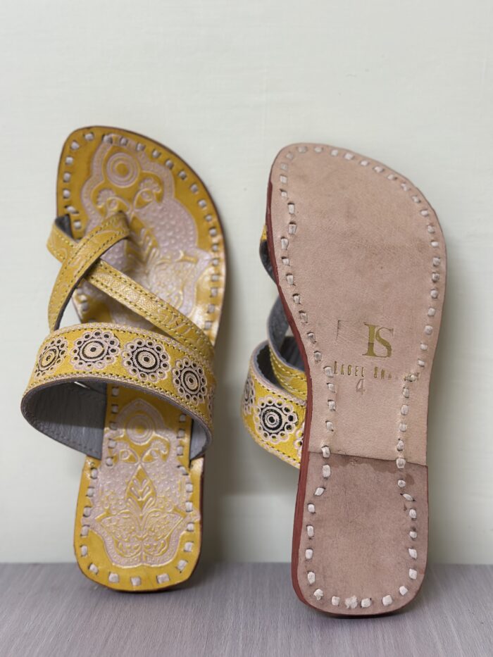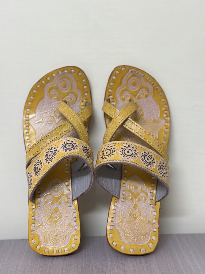 “Indulge in the artistry of our hand-painted Kolhapuri chappals, crafted with love on genuine leather. Originating from the cultural heartland of Kolhapur, with ‘PEELA CRISS CROSS ART‘ pair is a testament to the cherished tradition.